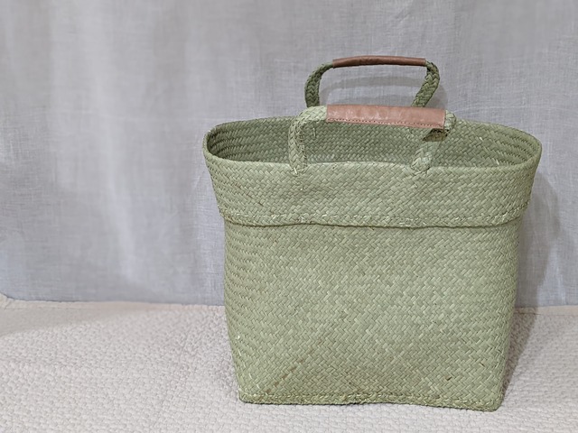 しなやかで軽い素材の「フルナ」と呼ばれる水草のカゴバッグです。革巻きハンドルがポイント。お買い物バッグとして、お部屋のインテリアバスケットとしても使えるナチュラルなバスケットです。 たっぷりと沢山荷物が入るので子育て中のママさんにもピッタリ! 大判のブランケットも楽々入ります。 ほんのり草の香りがして癒され これからの時期ピクニックにも良いですね。 ※4枚目の写真は含まれません。 【サイズ】 約 縦30、横35、奥行23(㎝) ハンドル32㎝ 【素材・成分】 水草・革 【生産地】 マダガスカル